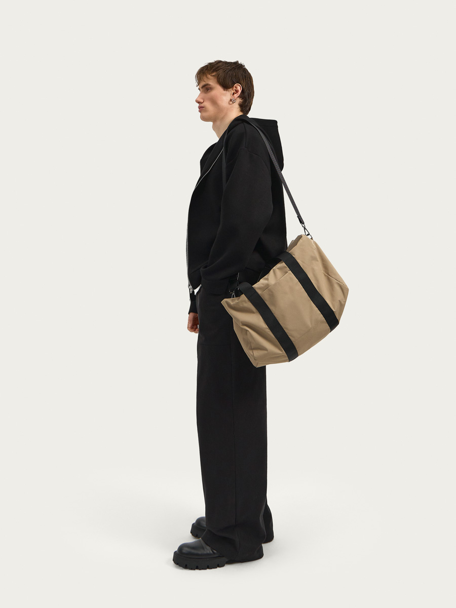 Вместительная сумка среднего объема имеет застежку на тракторную молнию, ручки из ременной ленты, съемный ремень с регулировкой по длине.