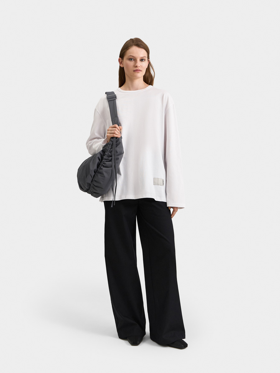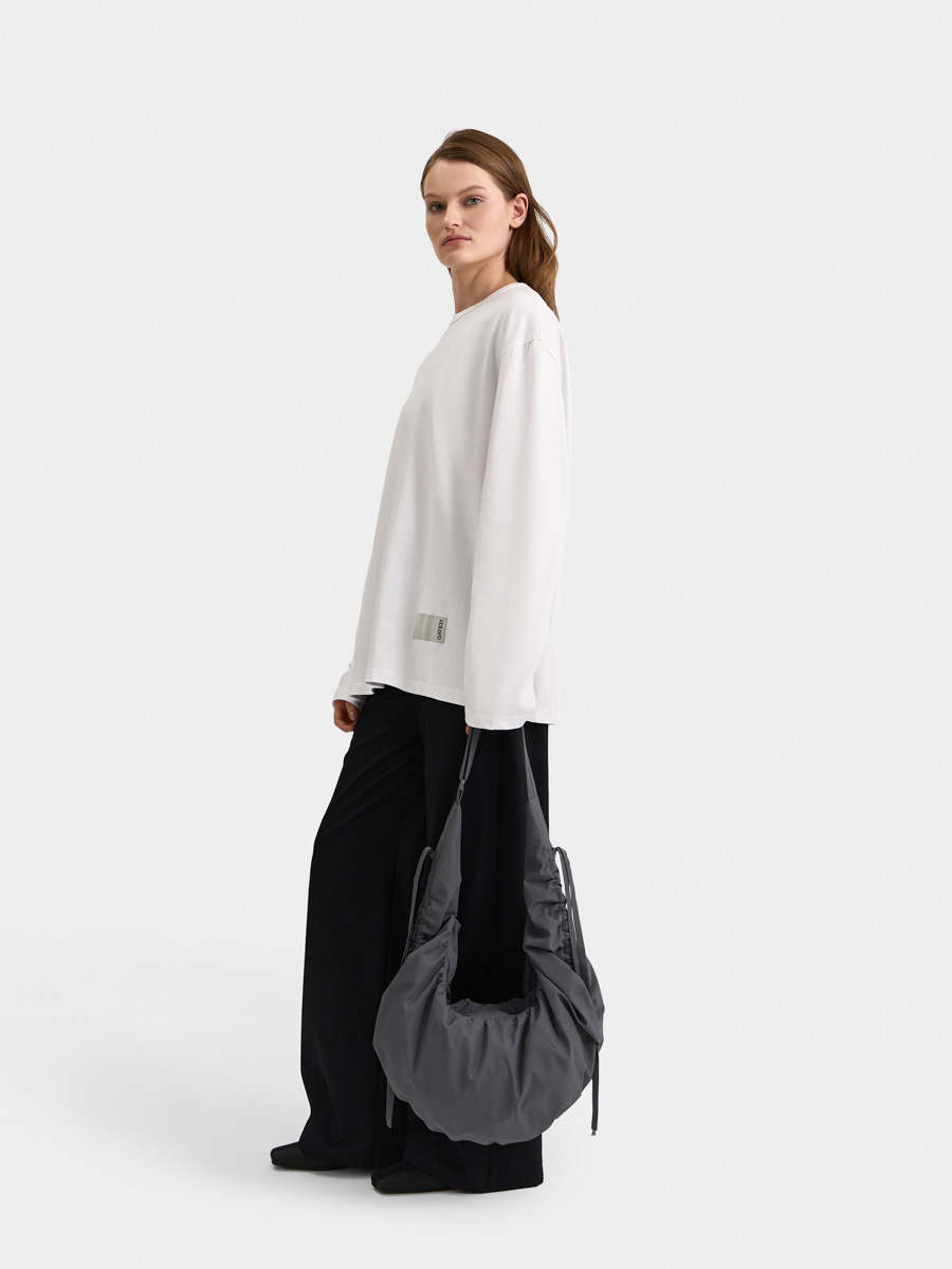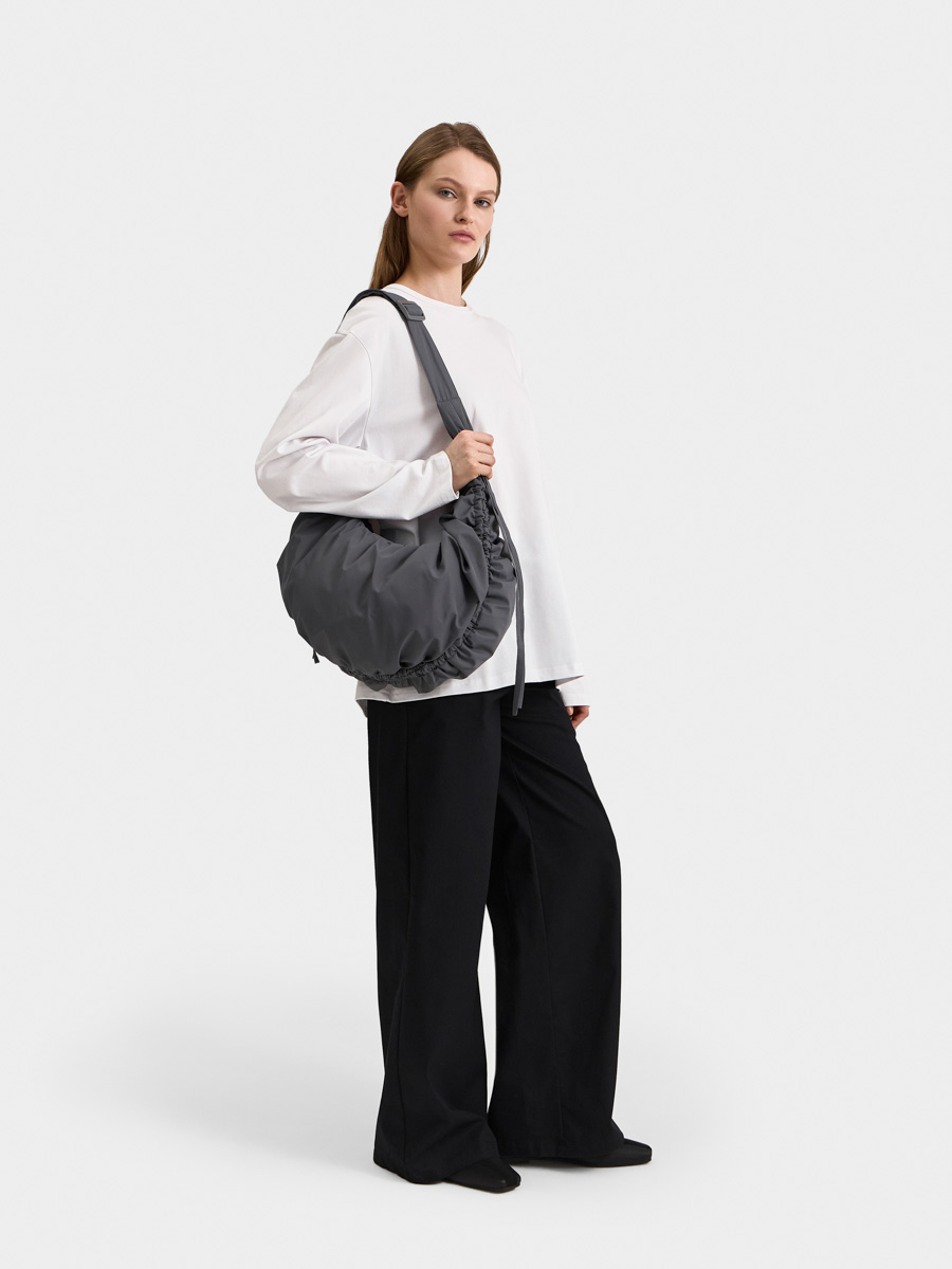 Сумка-хобо формы полумесяц со сборкой вдоль среднего шва. Сборку можно регулировать плоским шнуром в кулисах.