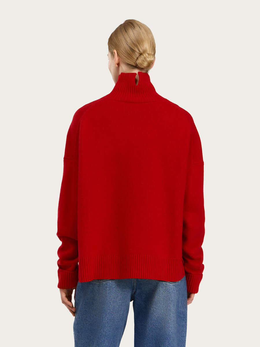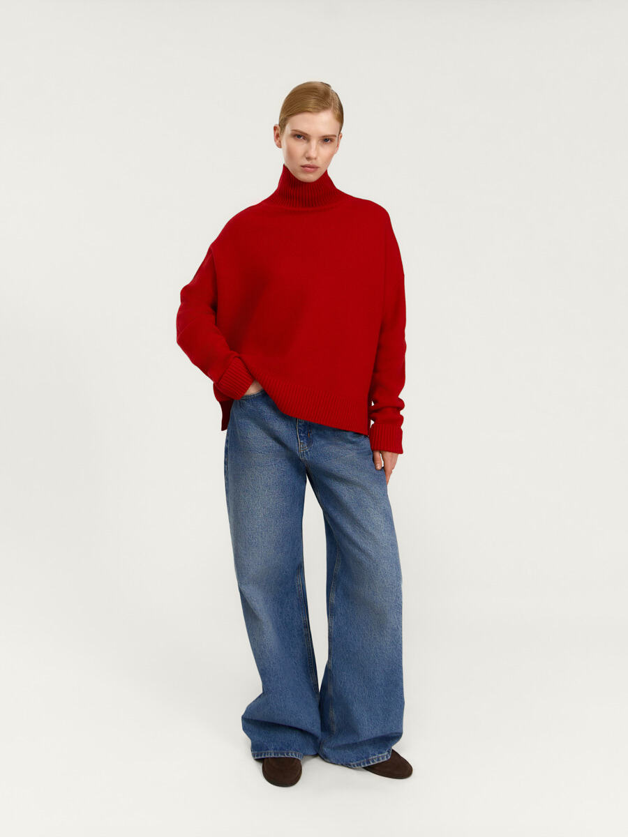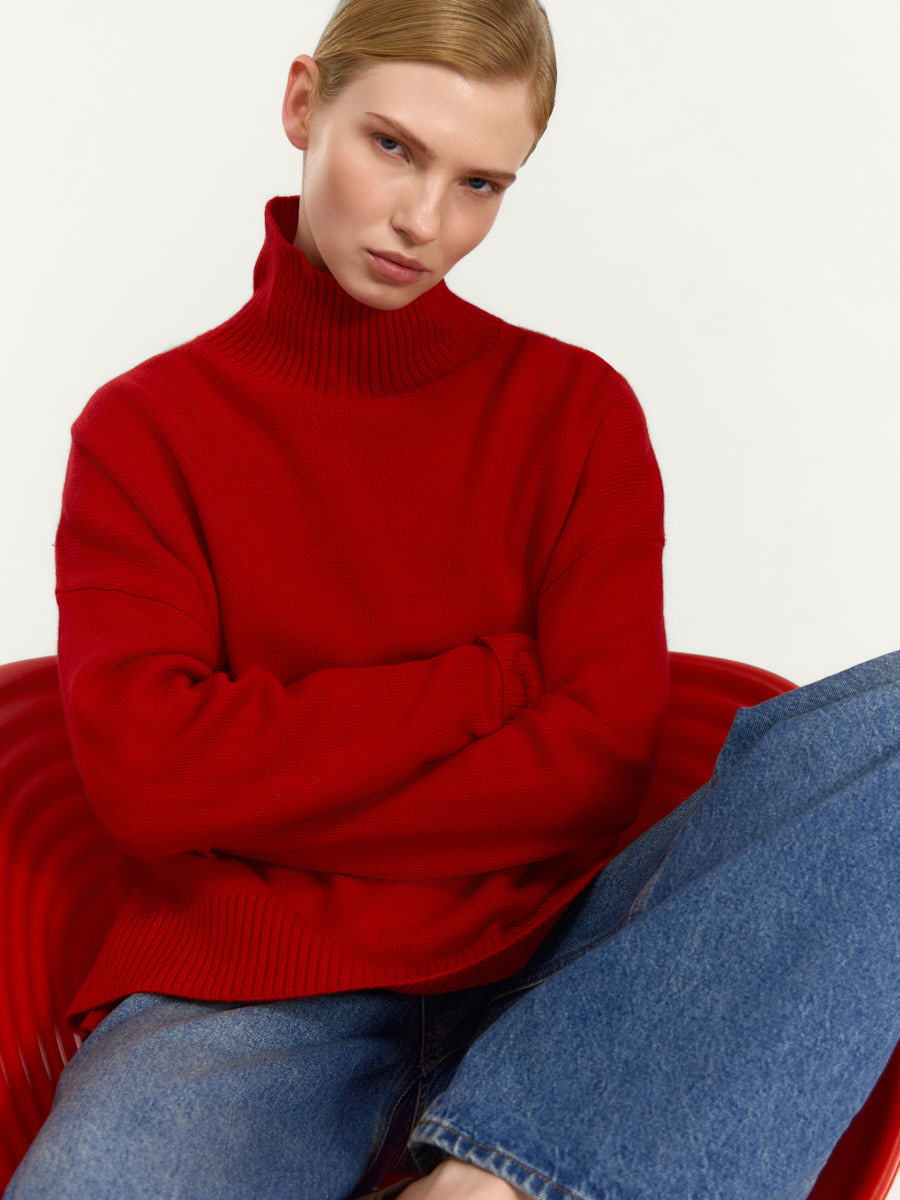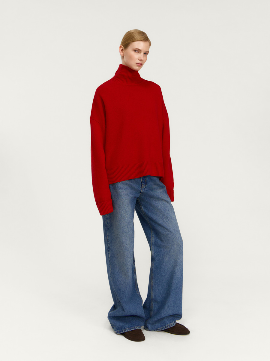 Свитер Астрид из мериносовой шерсти. Изделие имеет прямой силуэт, спущенную линию плеча, высокий воротник-стойку, длинные рукава. Воротник, низ рукавов и низ изделия связаны резинкой.