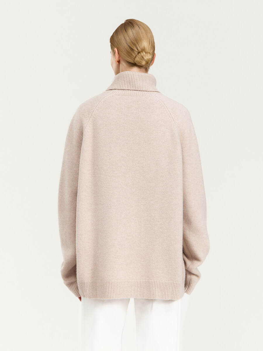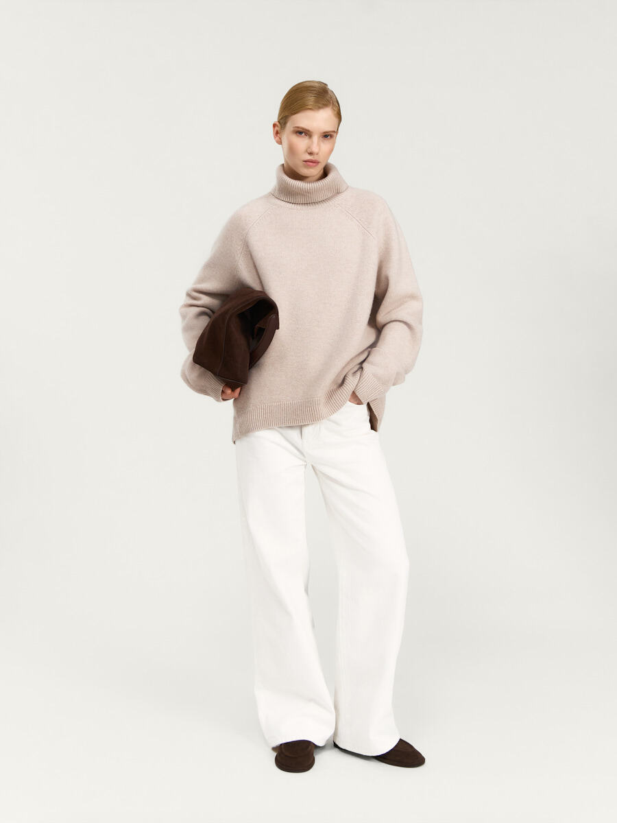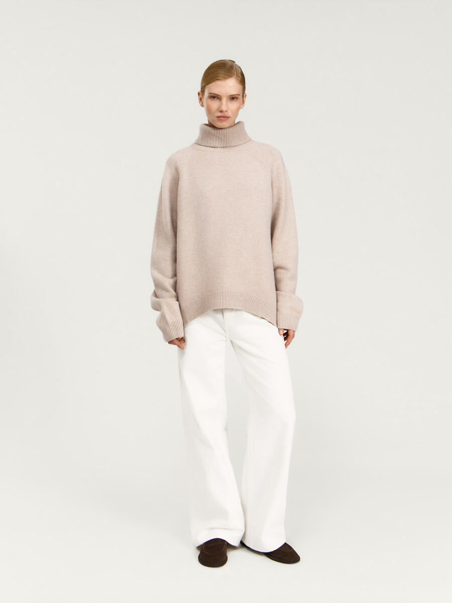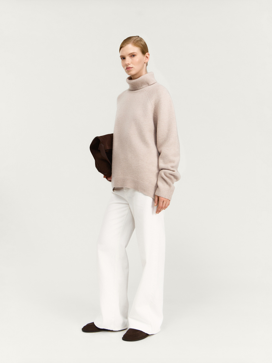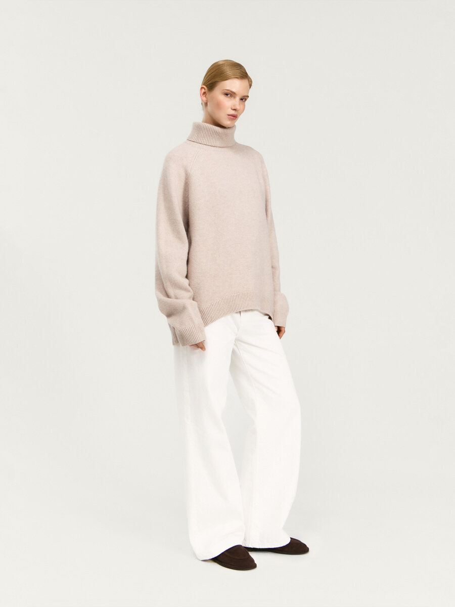 Свитер Элис прямого силуэта и свободного кроя, с длинным рукавом реглан, высоким воротником-стойкой и удлиненной спинкой. Свитер выполнен из 100% шерсти мериноса. Воротник, низ рукавов и низ изделия связаны резинкой. Шерстяной свитер - универсальная вещь в холодное время года, которая прекрасно впишется в ваш гардероб, а мягкая мериносовая пряжа порадует вас теплом.