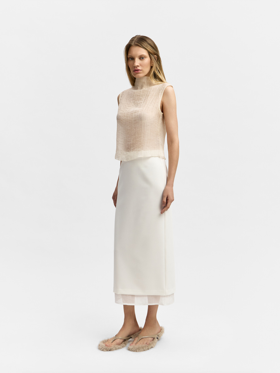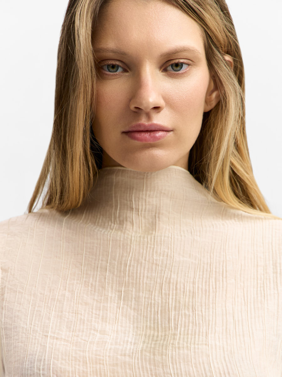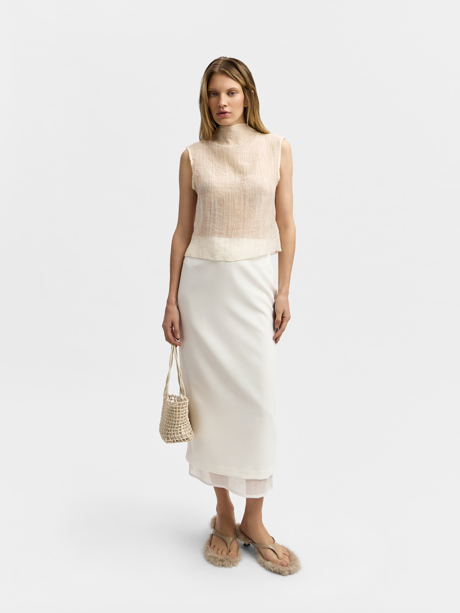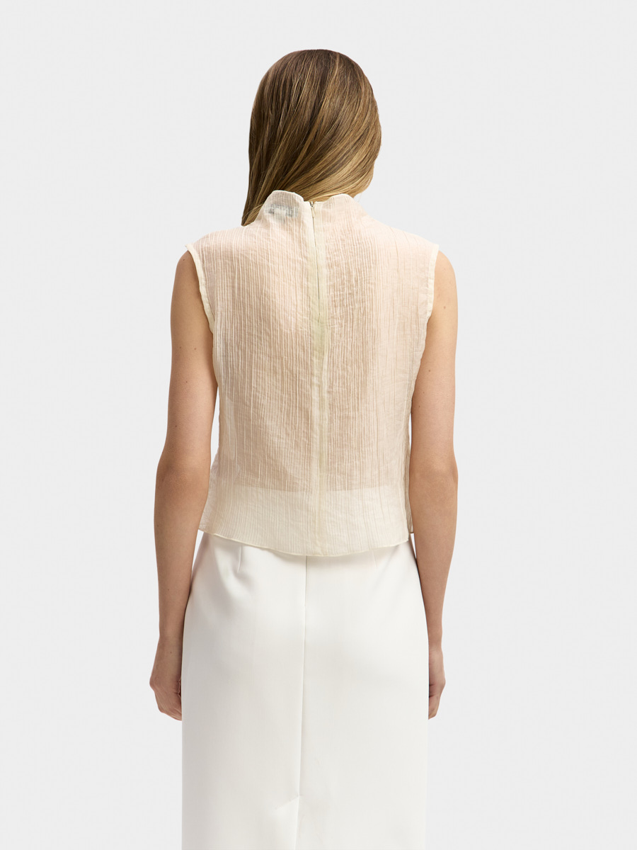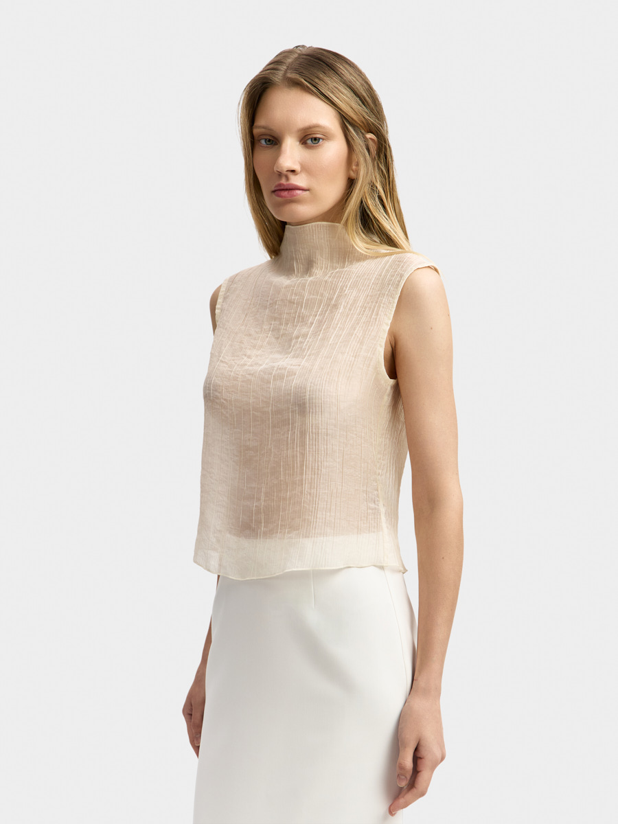 Топ Линда выполнен из воздушной полупрозрачной органзы с жатым эффектом.