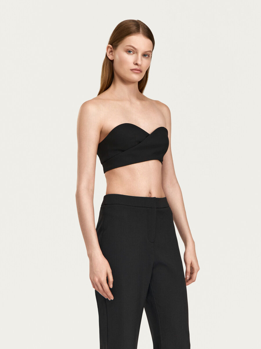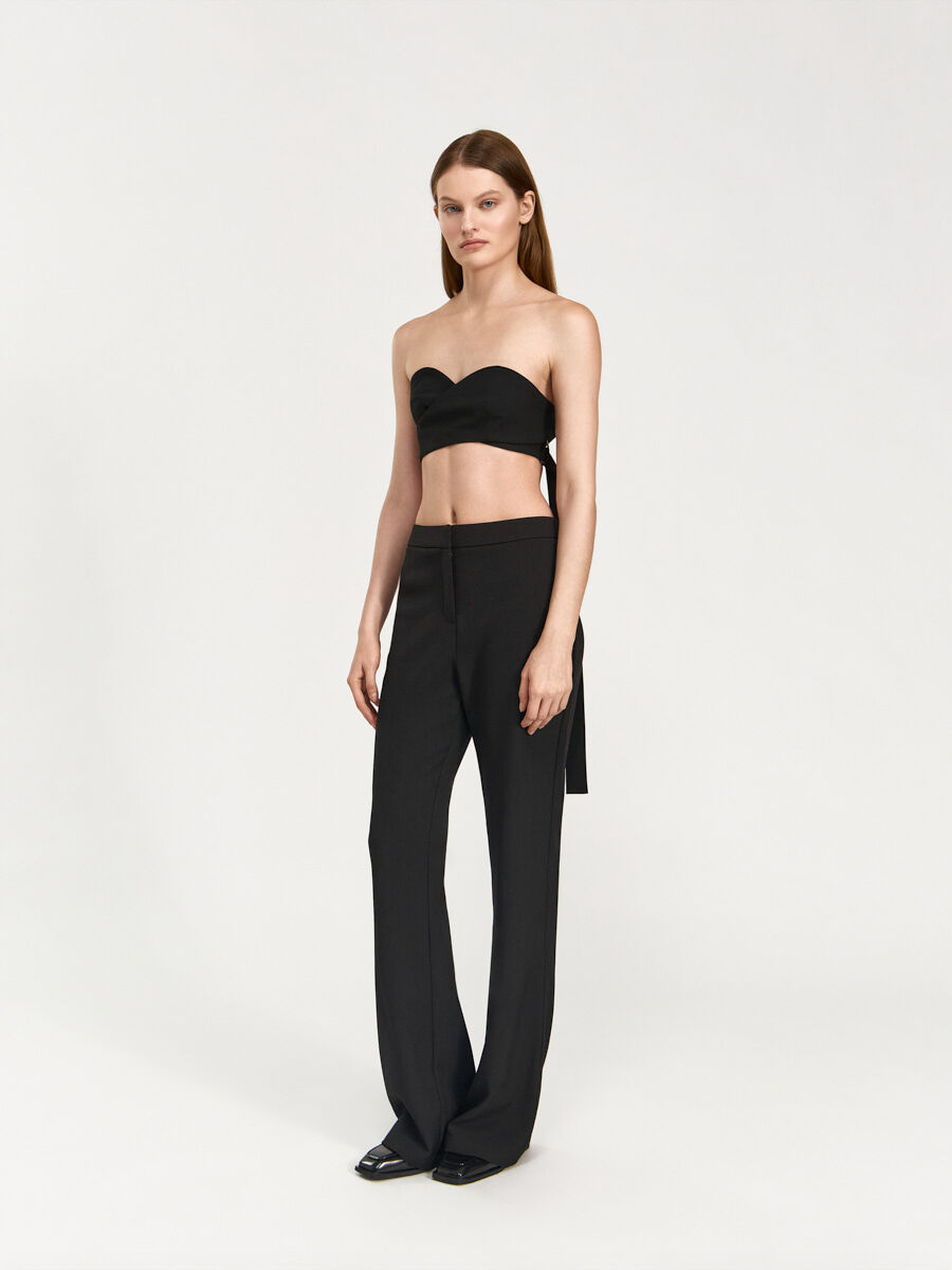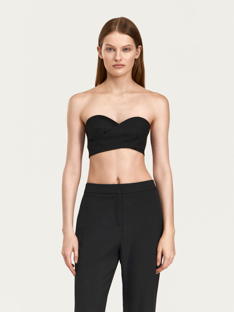 Топ-бюстье Линдси с деталями лифа на запах и фигурной верхней линией от “корсета” выполнен из костюмной ткани с вискозой. Детали лифа плавно переходят в детали поясов, которые фиксируются при помощи металлических полуколец, длинный пояс свободно свисает слева. Изделие выполнено на подкладке из основной ткани.