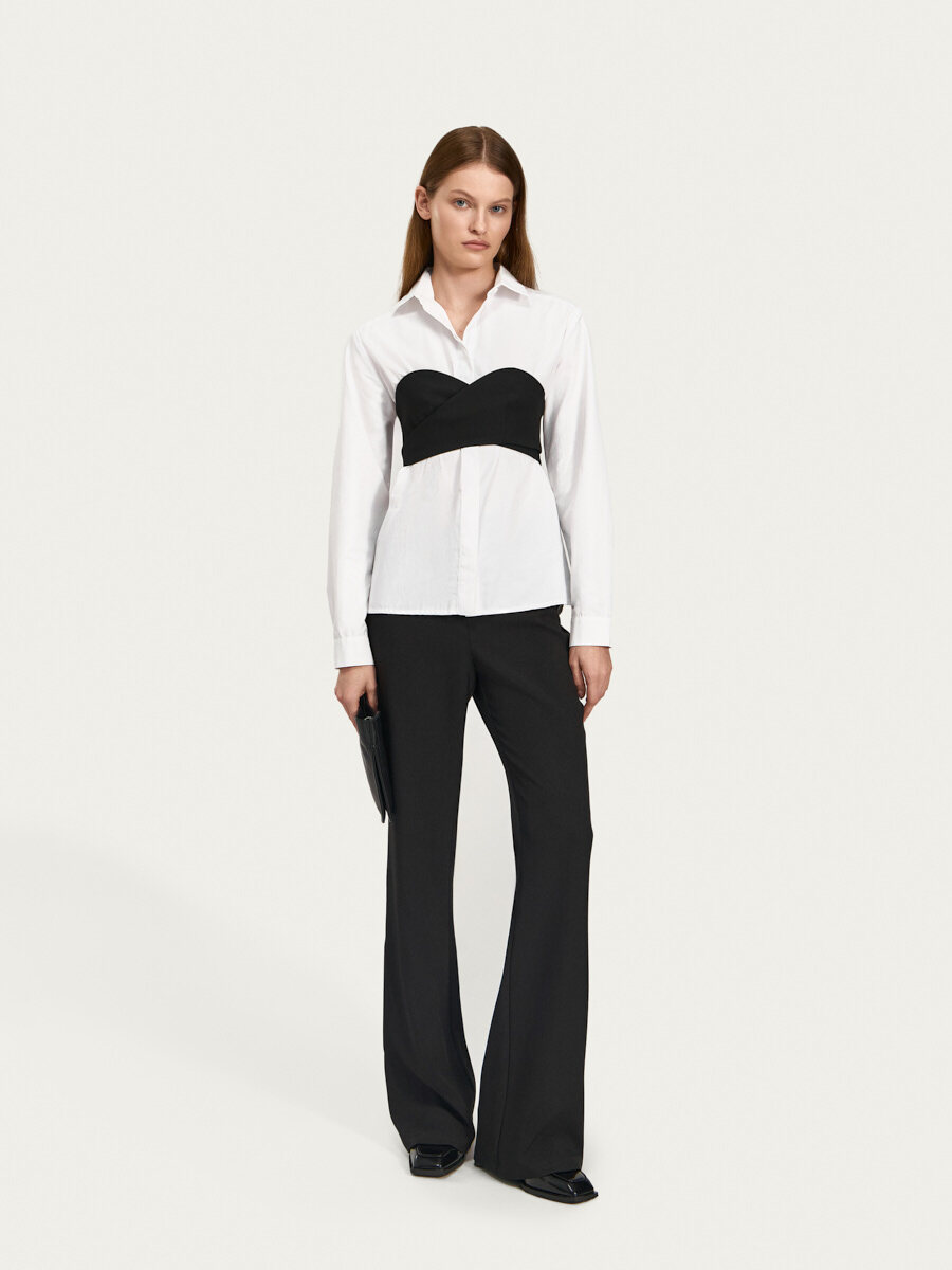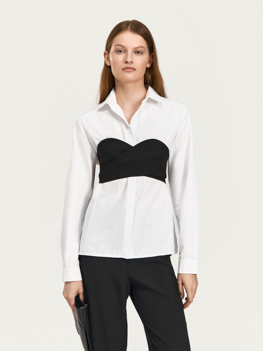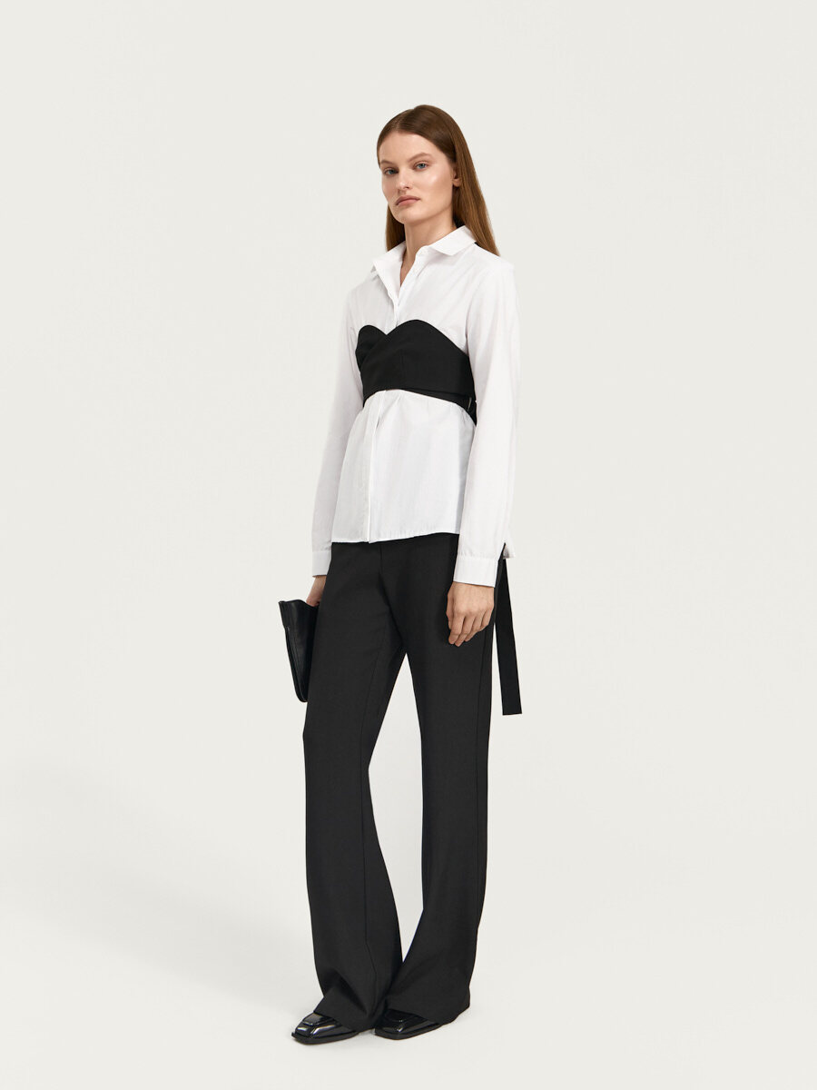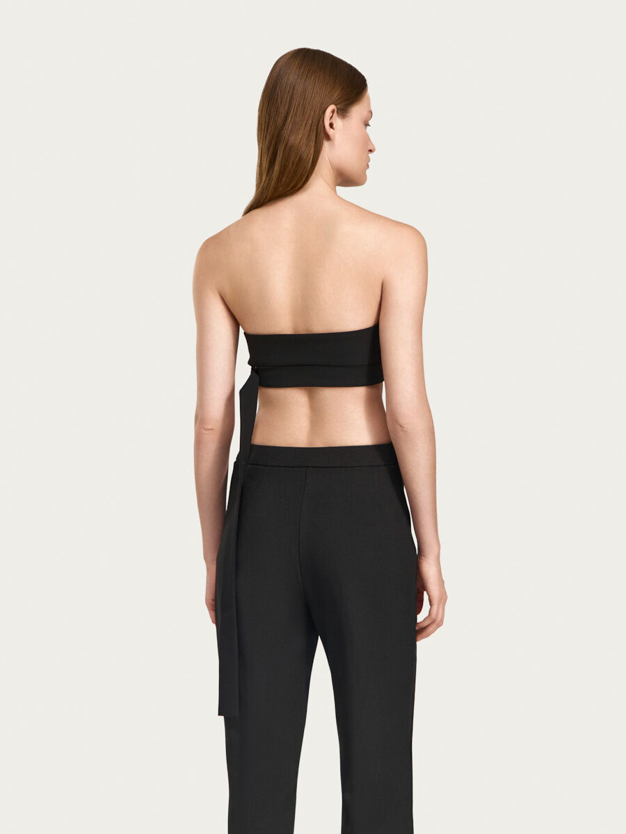Топ-бюстье Линдси с деталями лифа на запах и фигурной верхней линией от “корсета” выполнен из костюмной ткани с вискозой. Детали лифа плавно переходят в детали поясов, которые фиксируются при помощи металлических полуколец, длинный пояс свободно свисает слева. Изделие выполнено на подкладке из основной ткани.