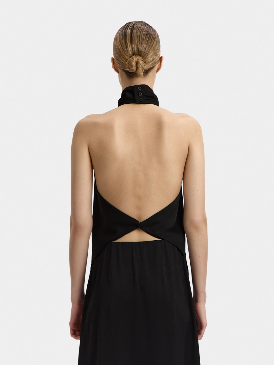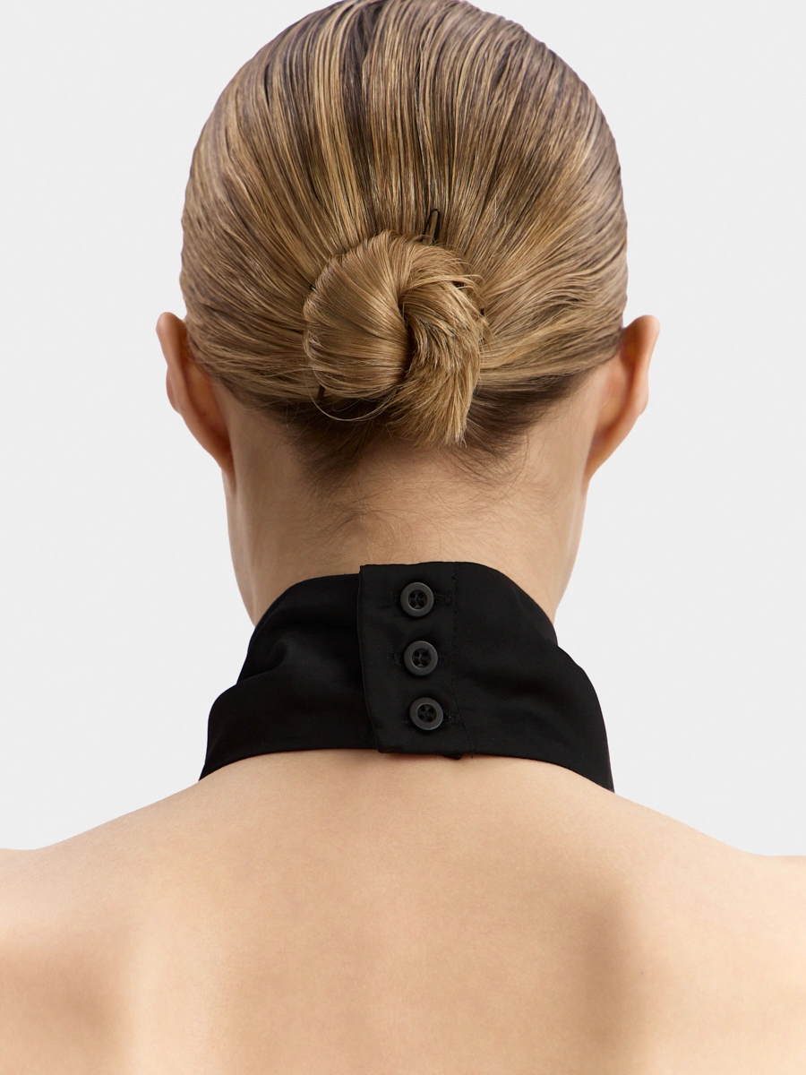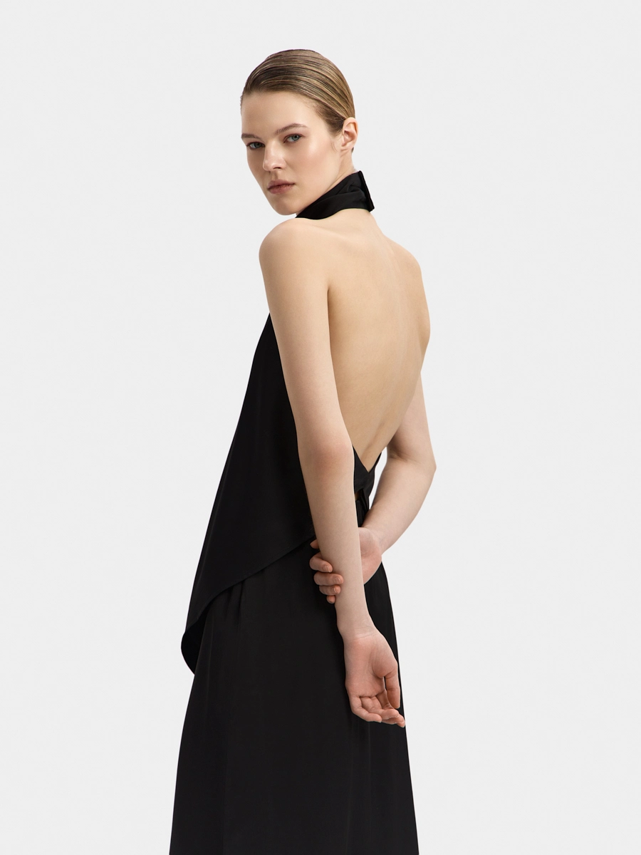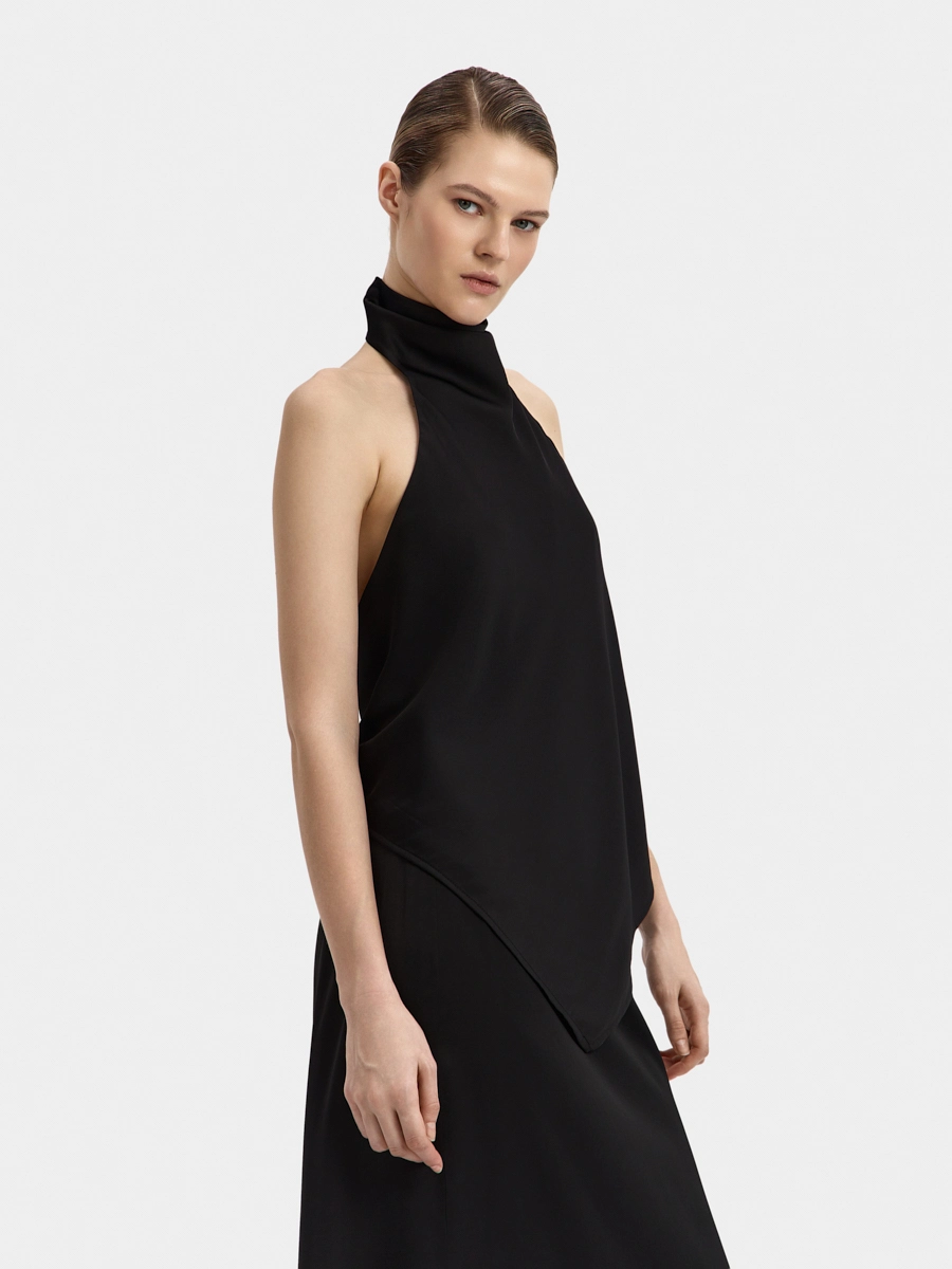 This backless top features a one-piece draped stand collar and an elongated front hem. The design resembles a silk scarf tied around the body. This top can be worn tucked in or untucked.