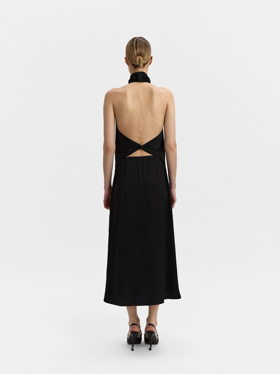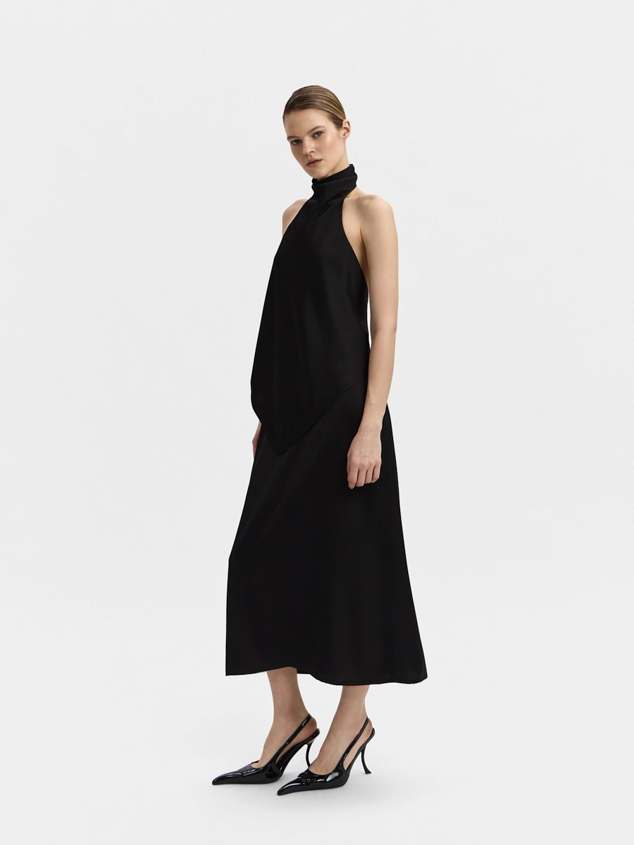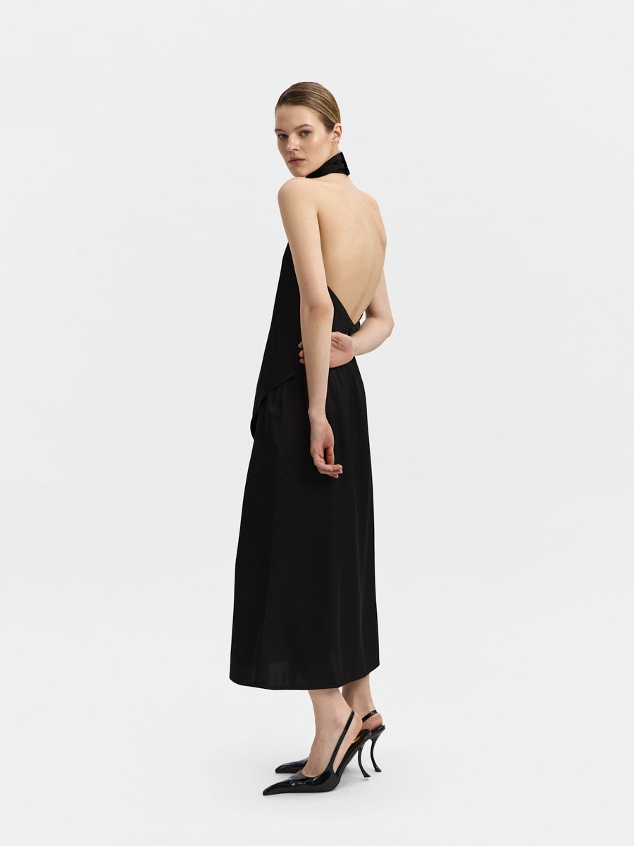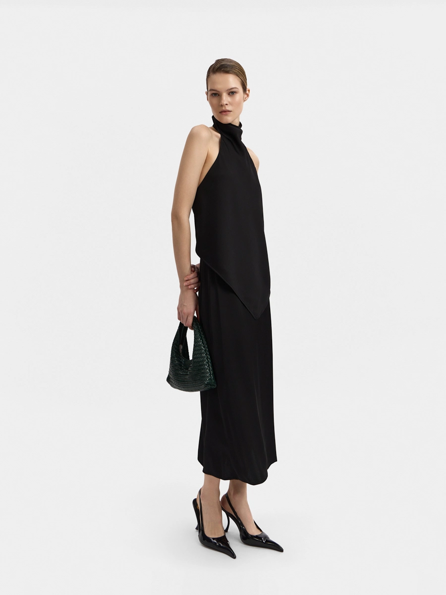 This backless top features a one-piece draped stand collar and an elongated front hem. The design resembles a silk scarf tied around the body. This top can be worn tucked in or untucked.