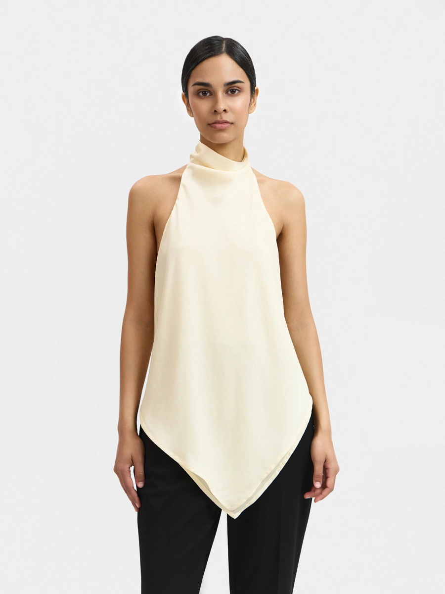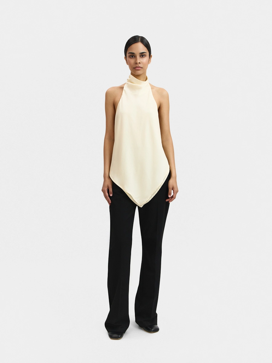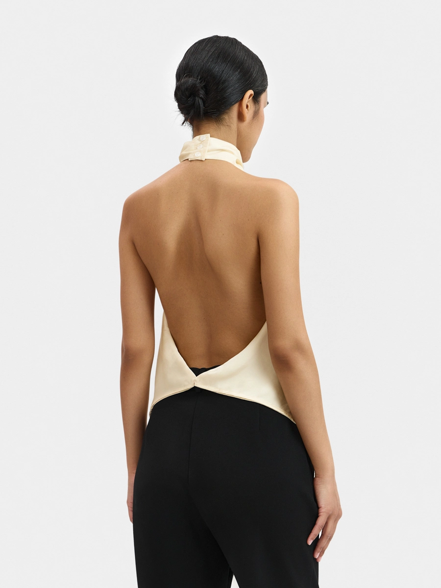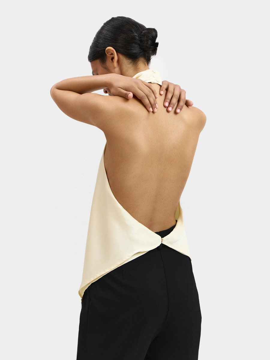 Топ с открытой спиной, цельнокроеной драпированной стойкой и удлинённым краем спереди.