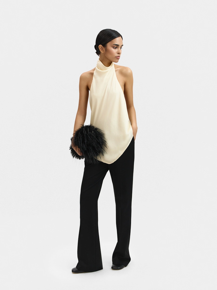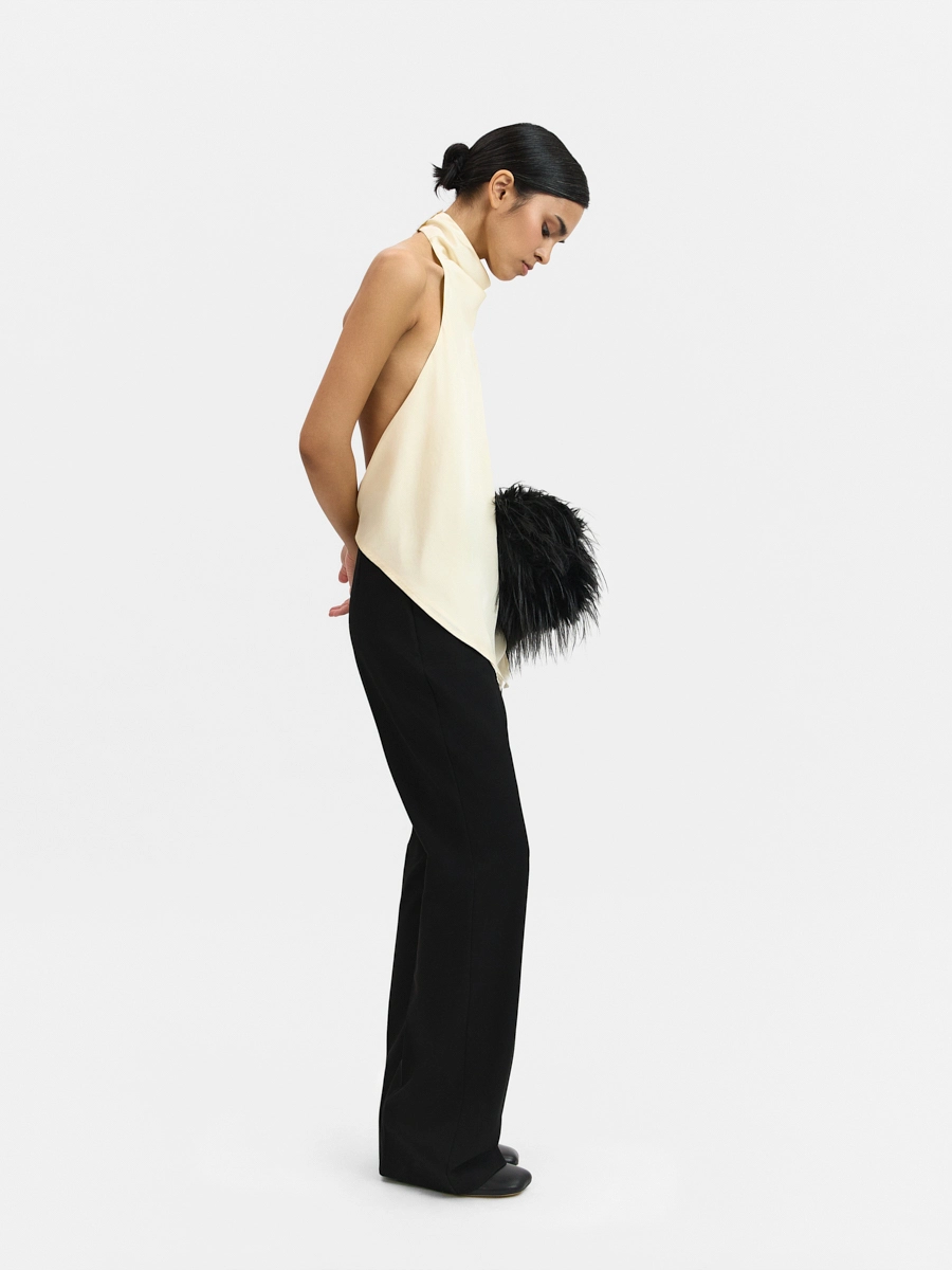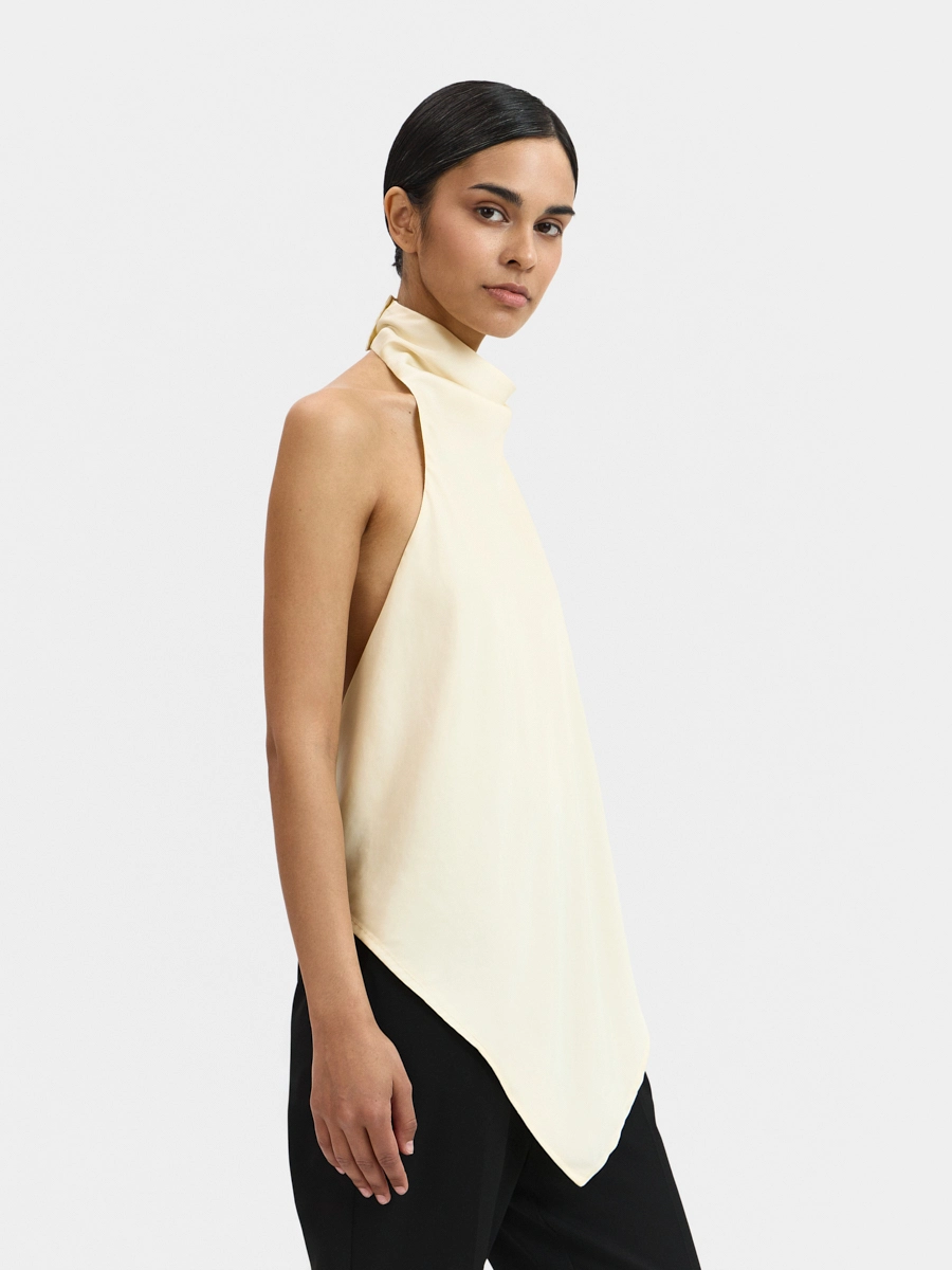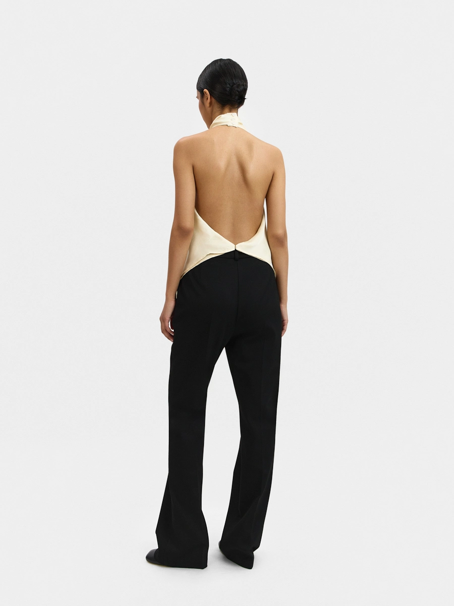 Топ с открытой спиной, цельнокроеной драпированной стойкой и удлинённым краем спереди.