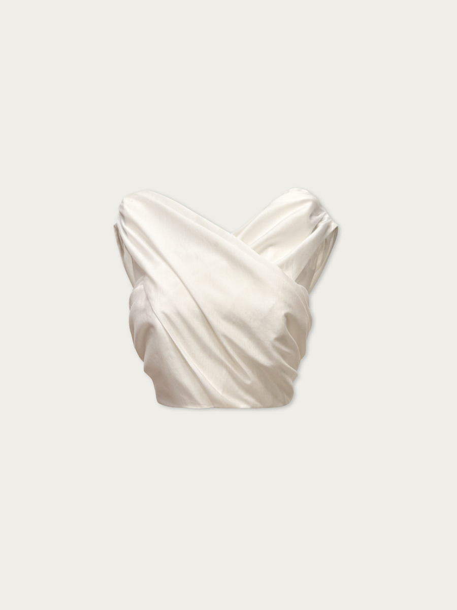 Топ декорирован драпировками из вуали, которые закладываются спереди крест-накрест и переходят в широкие бретели на спинке.