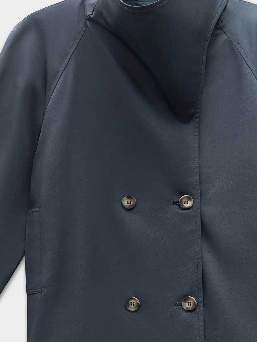 Сropped trench coat Andorra has a straight cut with raglan sleeves and is made of dense coated cotton fabric. This trench coat features a double-breasted button closure and a high asymmetrical stand collar with a side fastening. The front panels have welt pockets with flaps. The back has a center seam. Shoulder straps with loops and button closures are located on the shoulders, and the sleeves are finished with tab closures at the hem.