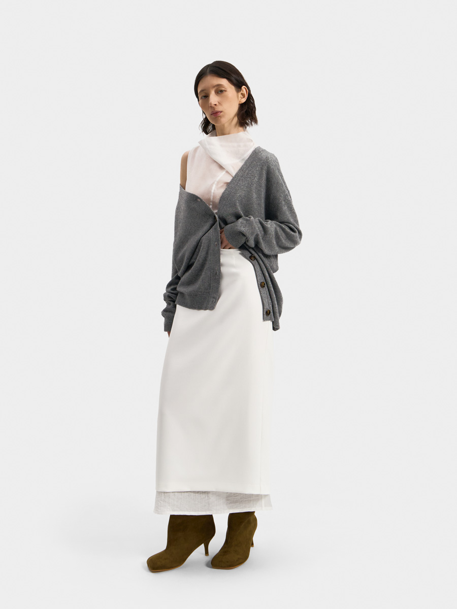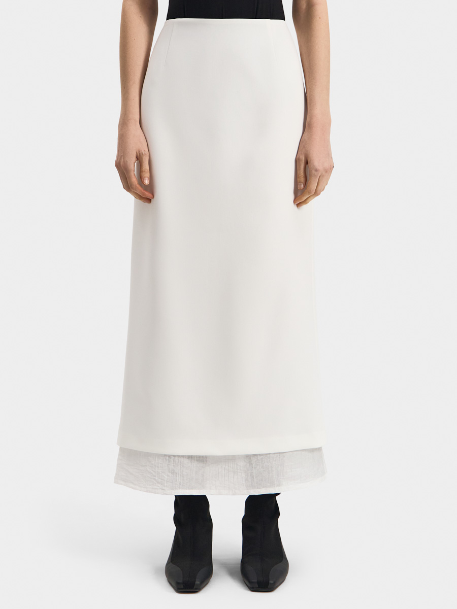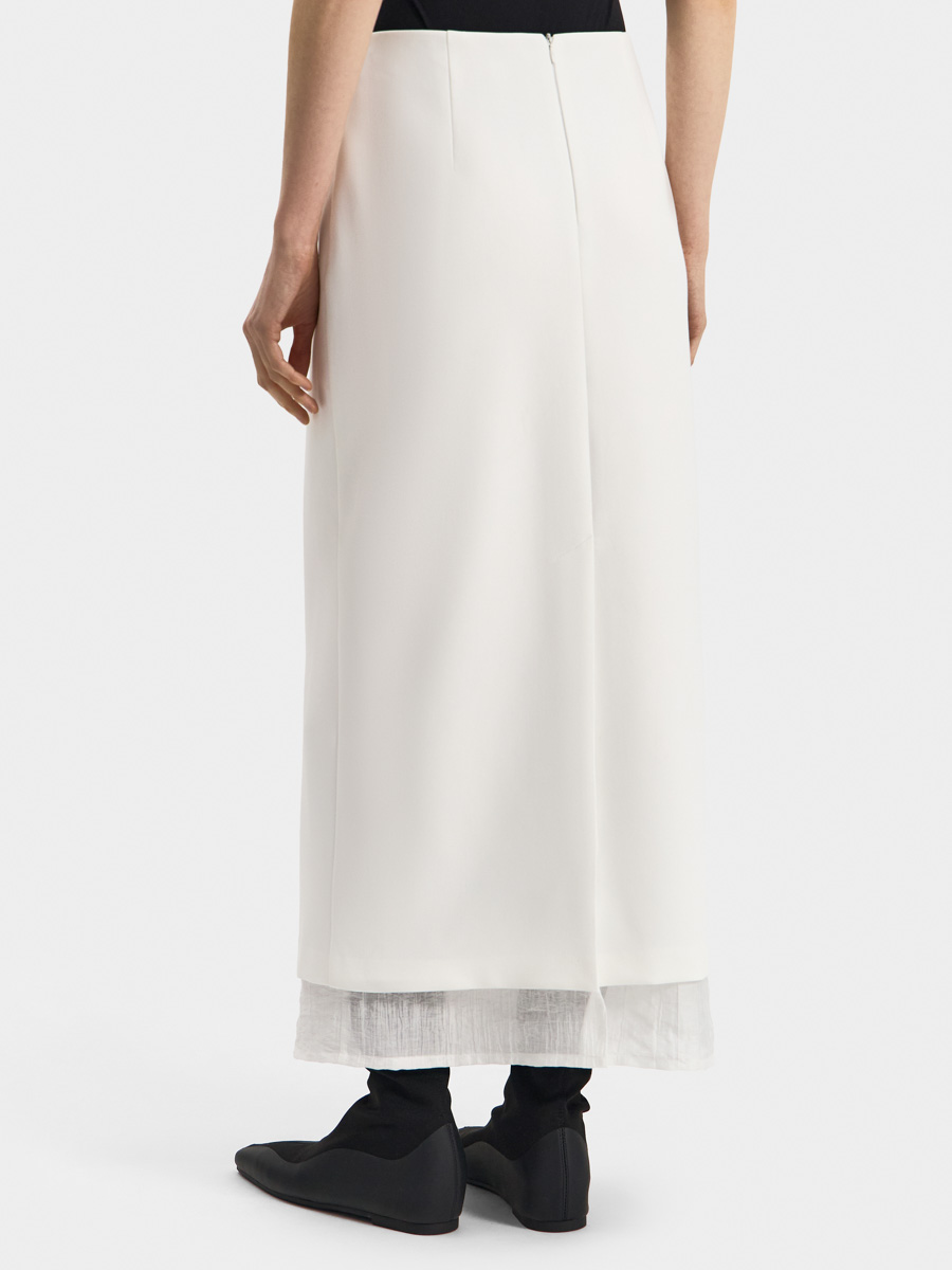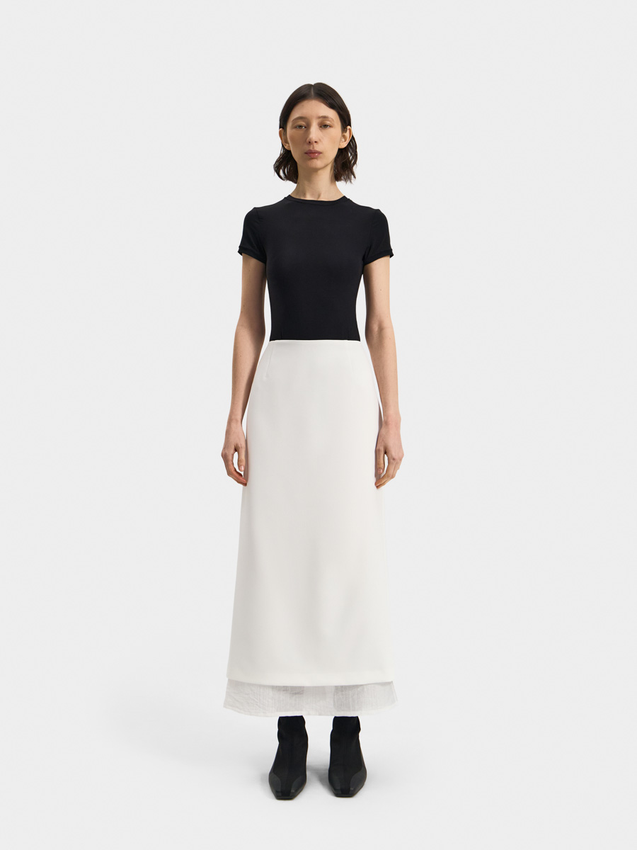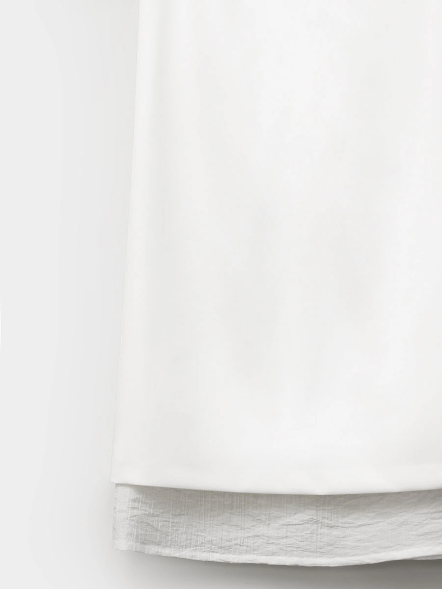 Юбка выполнена в два слоя с полупрозрачной фактурной тканью. Нижний слой длиннее верхнего и визуально облегчает образ, добавляет романтичности.