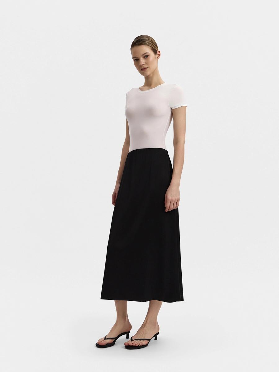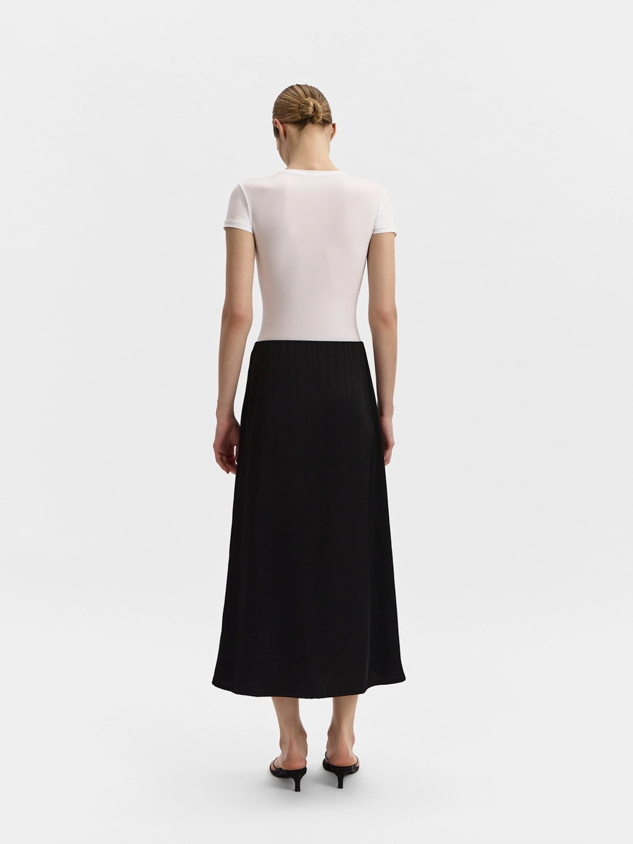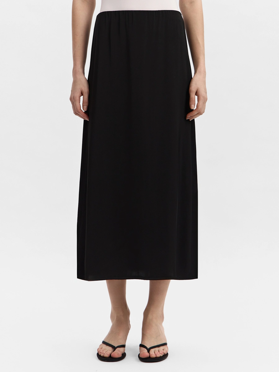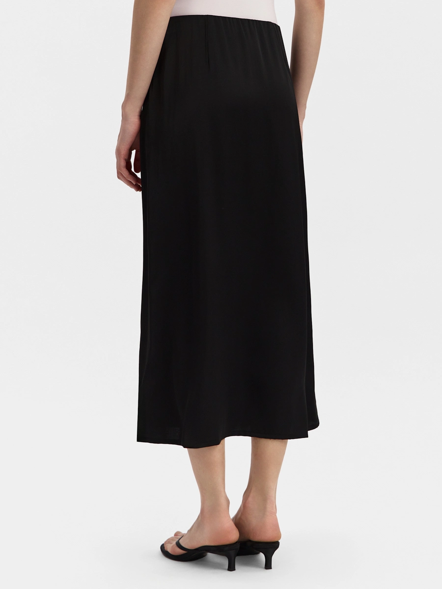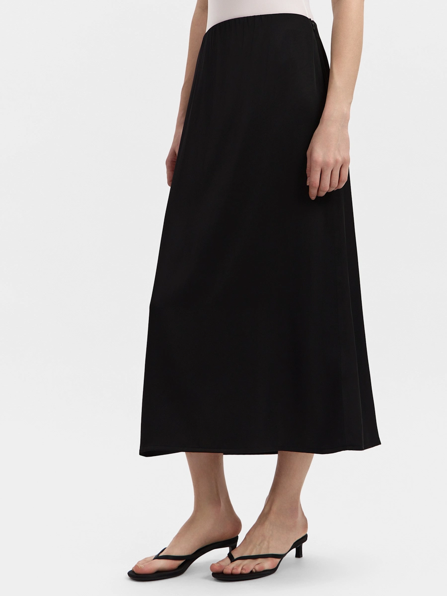Flared skirt Layla has a mid-rise waist and is made of satin fabric with a light, pleasant sheen. This maxi-length skirt features a subtle flared hem. The back panel has waist darts, and a concealed zipper is set into the side seam. The waistband is finished on the inside with a wide elastic facing for a comfortable fit.