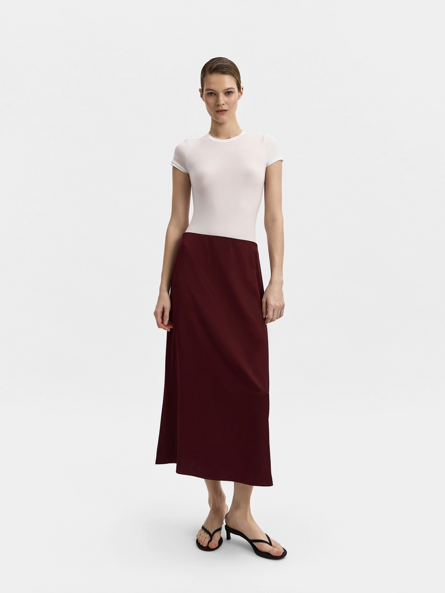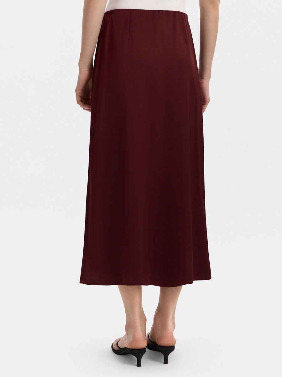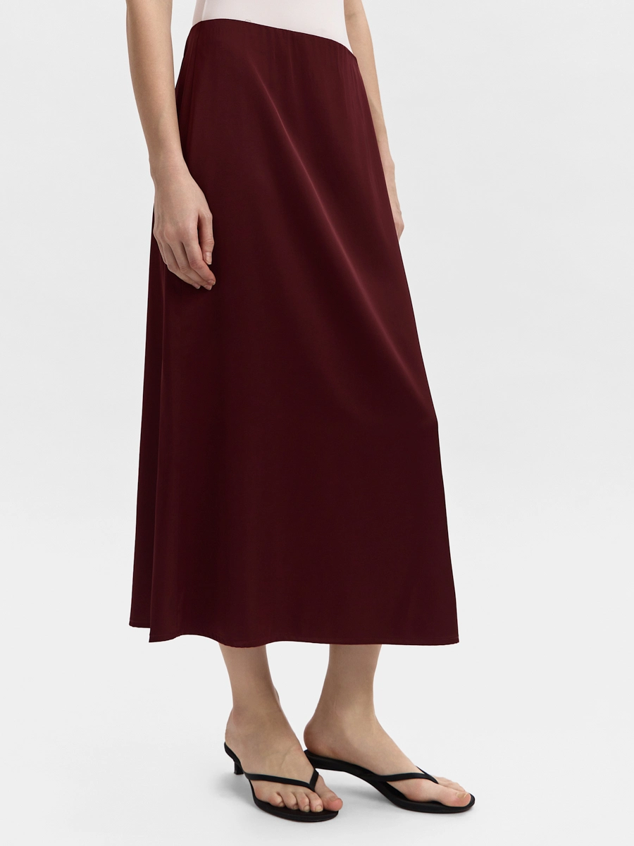 Flared skirt Layla has a mid-rise waist and is made of satin fabric with a light, pleasant sheen. This maxi-length skirt features a subtle flared hem. The back panel has waist darts, and a concealed zipper is set into the side seam. The waistband is finished on the inside with a wide elastic facing for a comfortable fit.