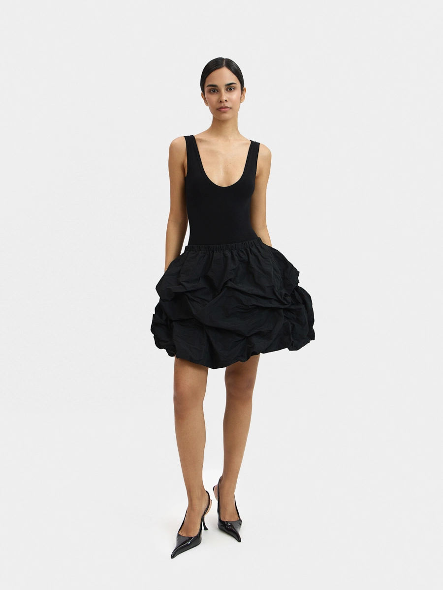 This voluminous skirt features soft, airy gatherings throughout, an elasticated waistband, and a mini length. The garment is fully lined.