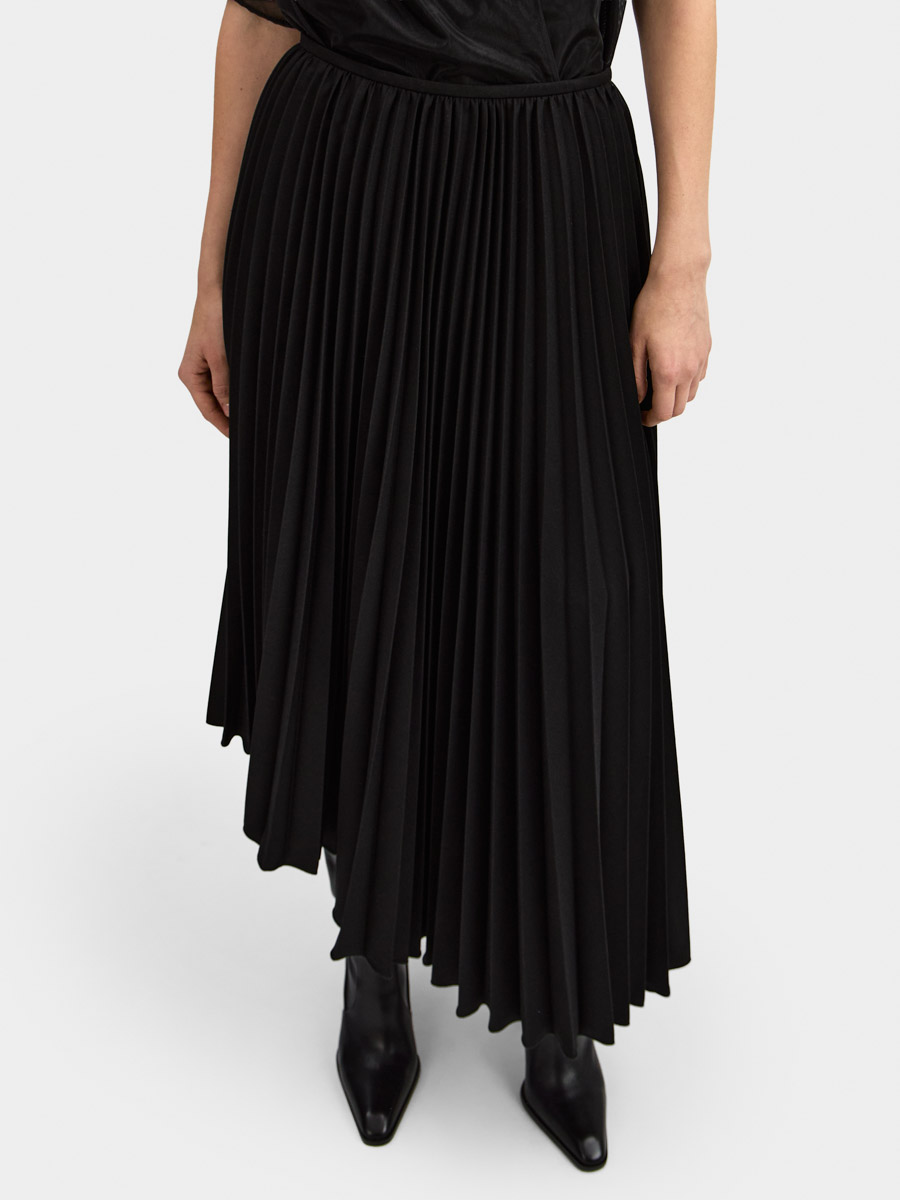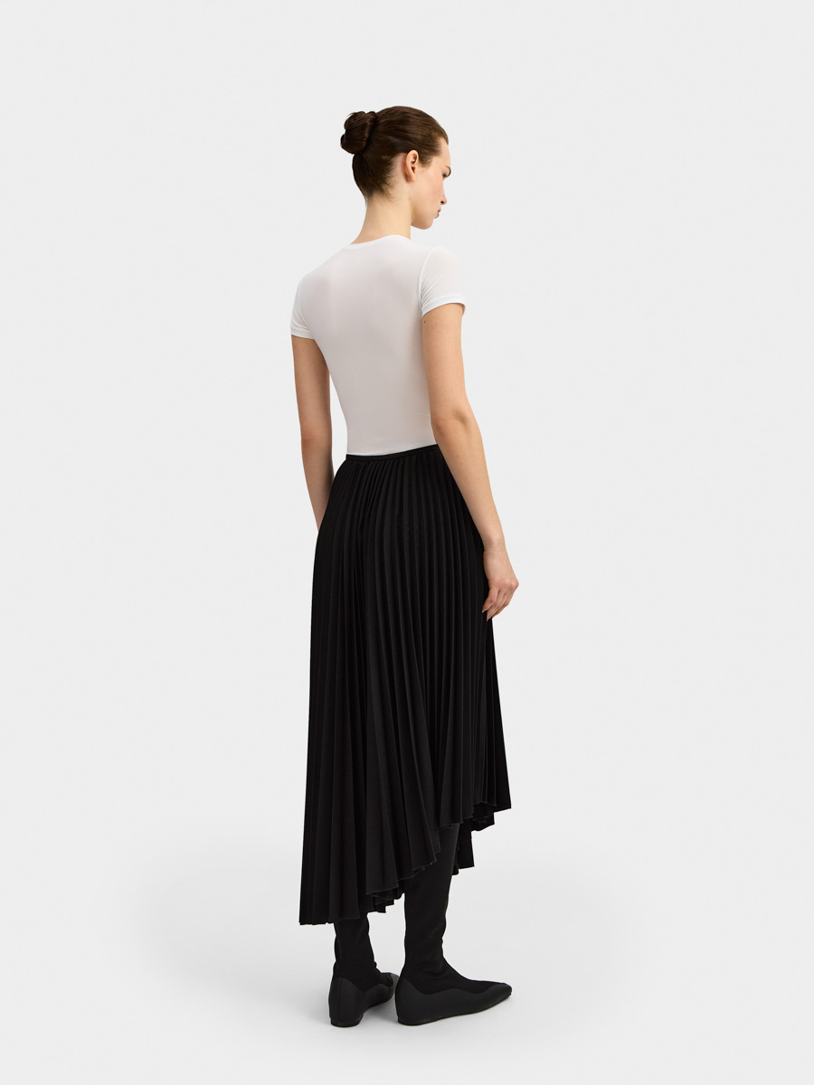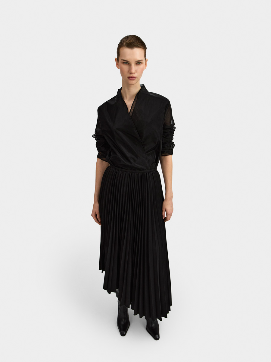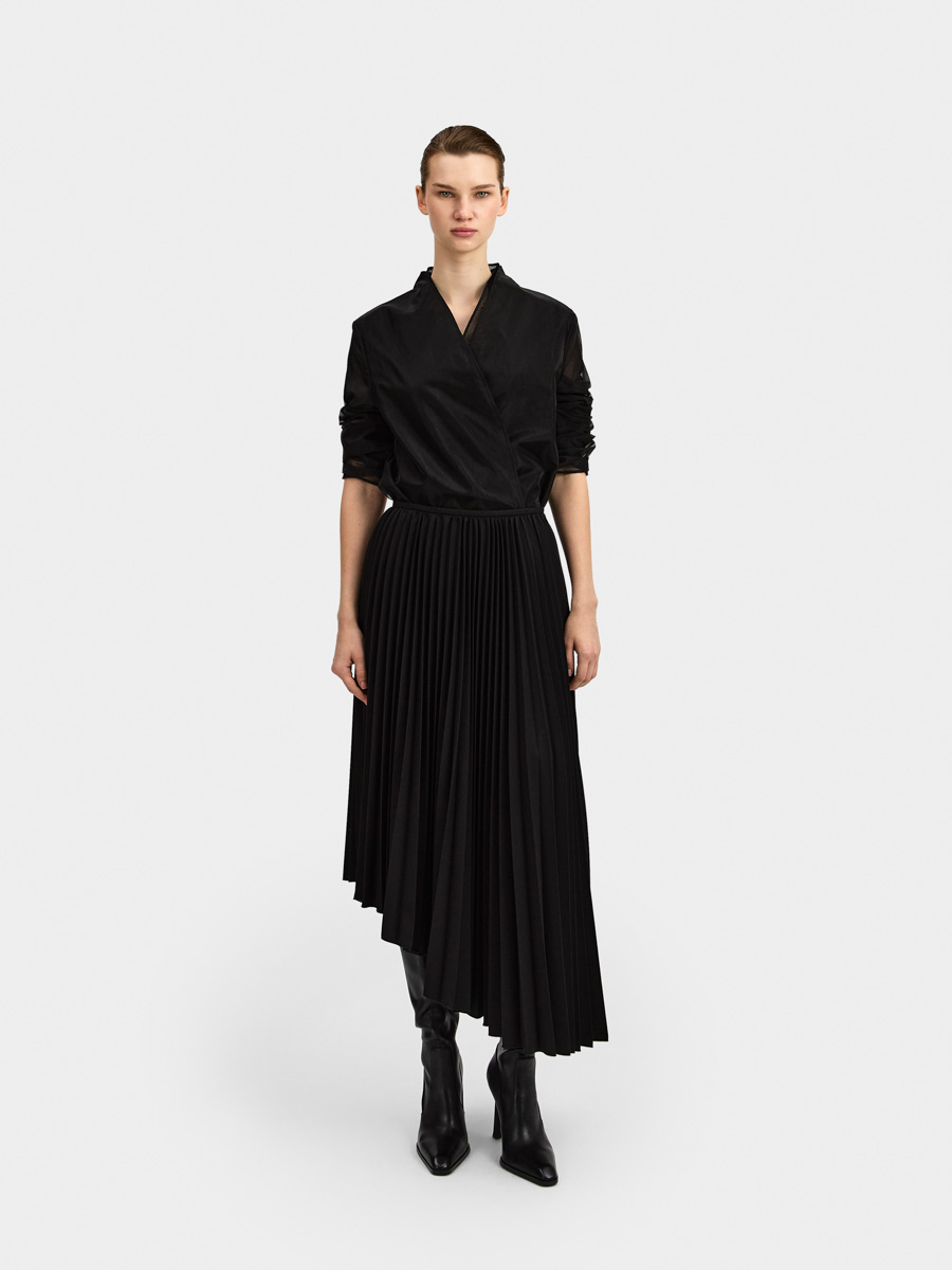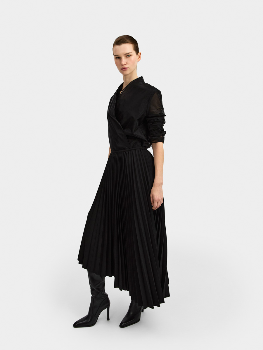 Асимметричный низ дополняет плиссированную фактуру юбки.