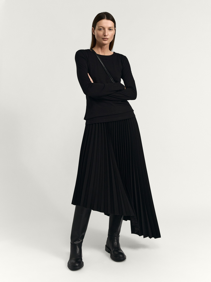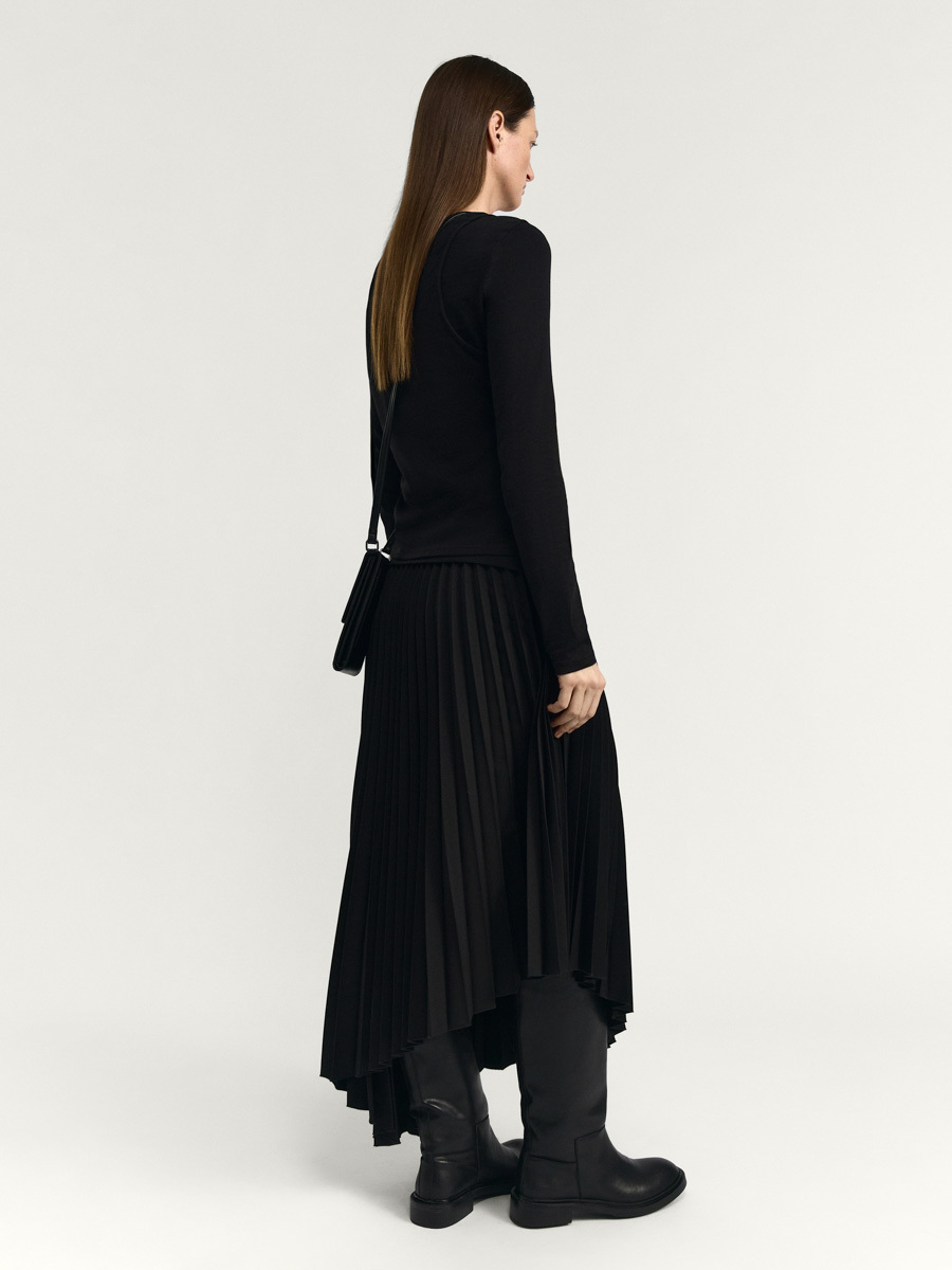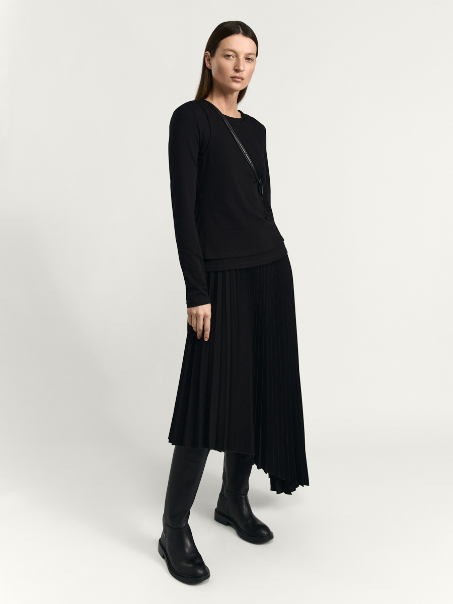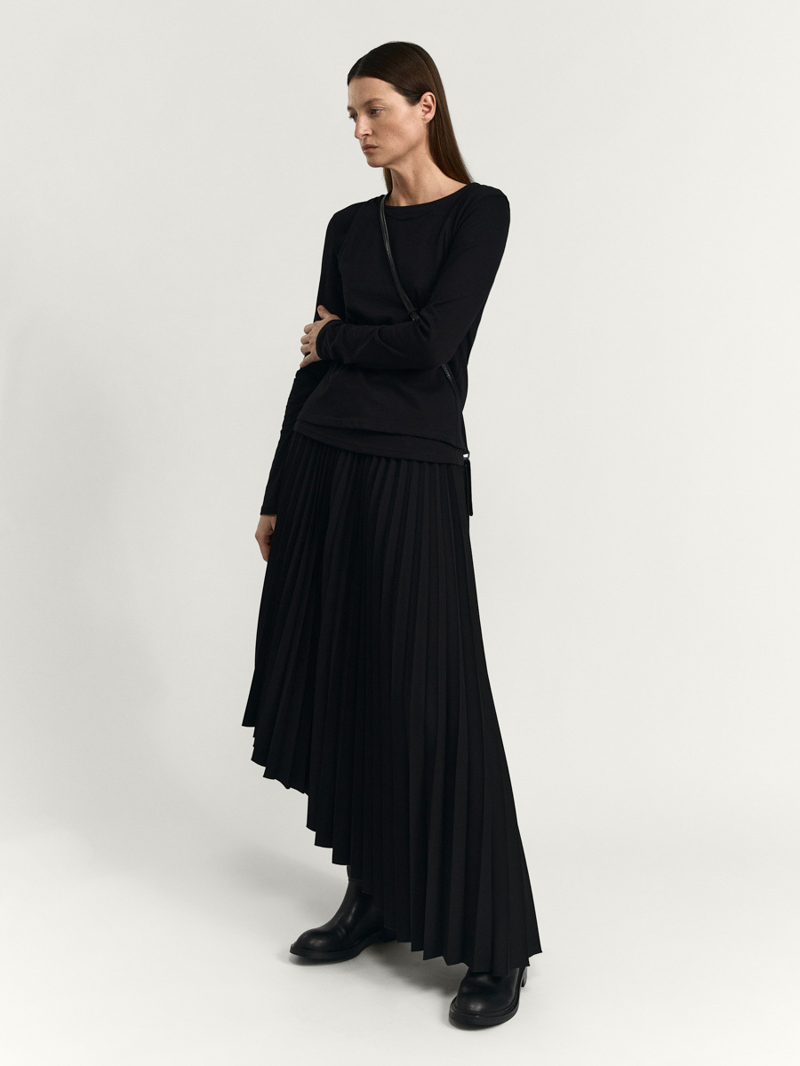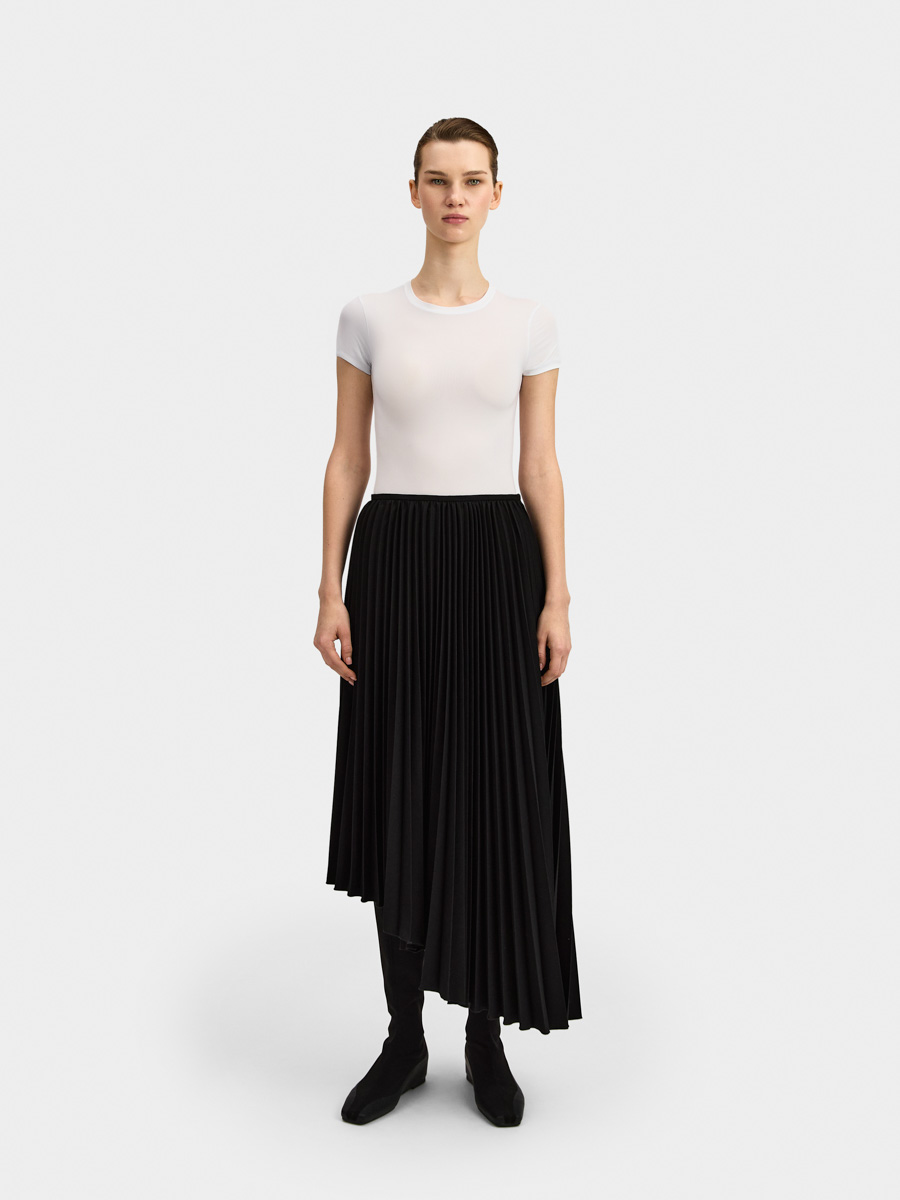 Асимметричный низ дополняет плиссированную фактуру юбки.