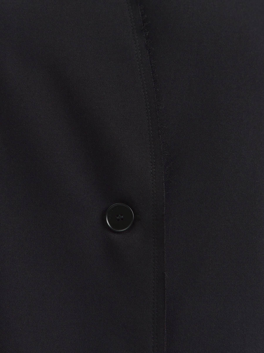 Однобортный жакет прямого силуэта с застежкой на две пуговицы с цельнокроеным воротником, край борта и воротника выполнены с так называемым необработанным срезом (по краю проложена двойная закрепочная строчка), на полочках расположены прорезные карманы с клапанами, спинка со средним швом и шлицей, рукава двухшовные со шлицами и декоративными пуговицами сзади. Изделие на подкладке.