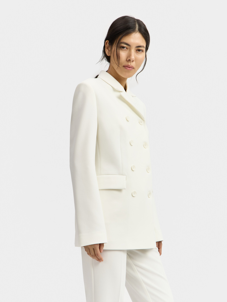 Удлиненный жакет с двубортной застежкой на пуговицы, воротник с лацканами, на полочках прорезные карманы с листочкой и клапаном, спинка со средним швом, рукав двухшовный, изделие на подкладке.