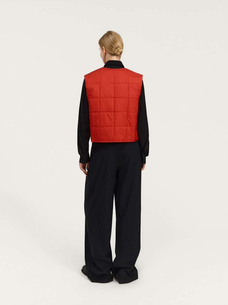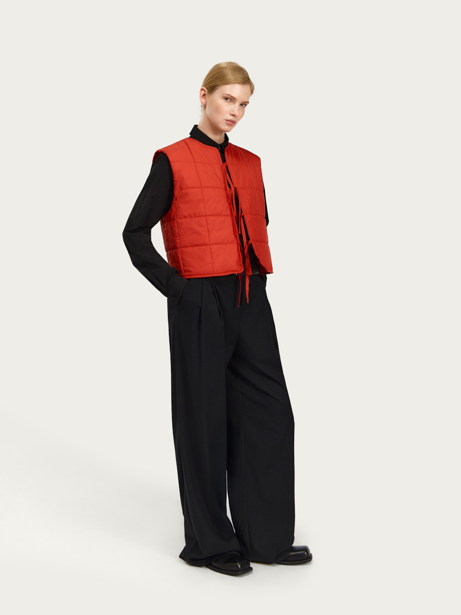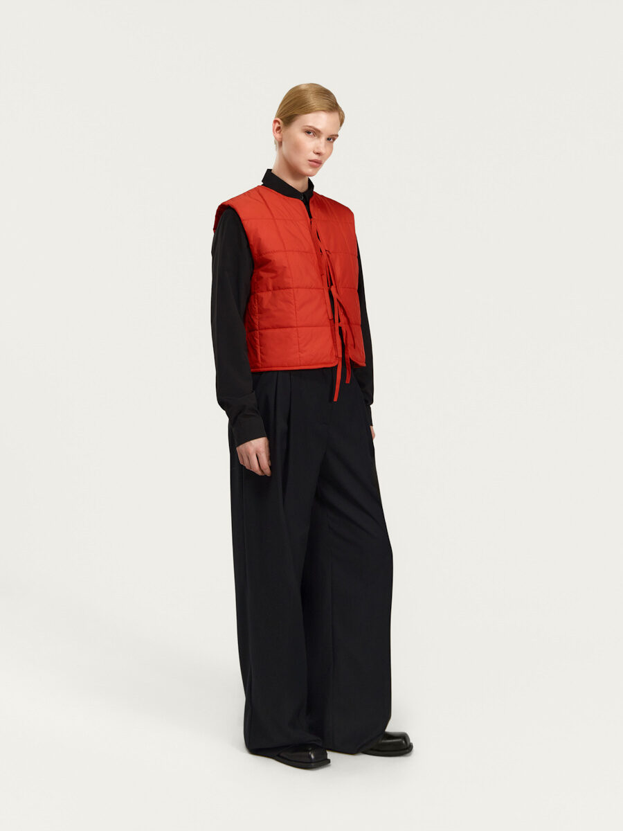 Укороченный жилет прямого силуэта без воротника, со скругленными уголками борта и завязками.